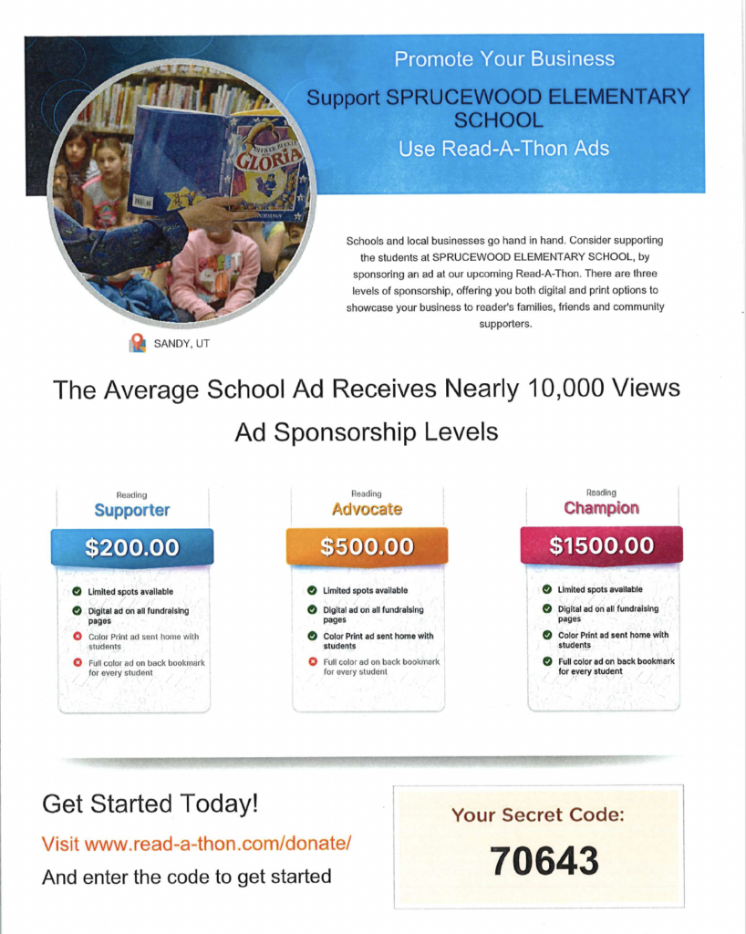 We are looking for business sponsors of Reading Supporter ($200), Reading Advocate ($500), and Reading Champion ($1,500). To become a sponsor of our school wide Read A Thon, go to http://www.read-a-thon.com/donate and enter the code 70643 to get started. Thanks in advance for your sponsorship!