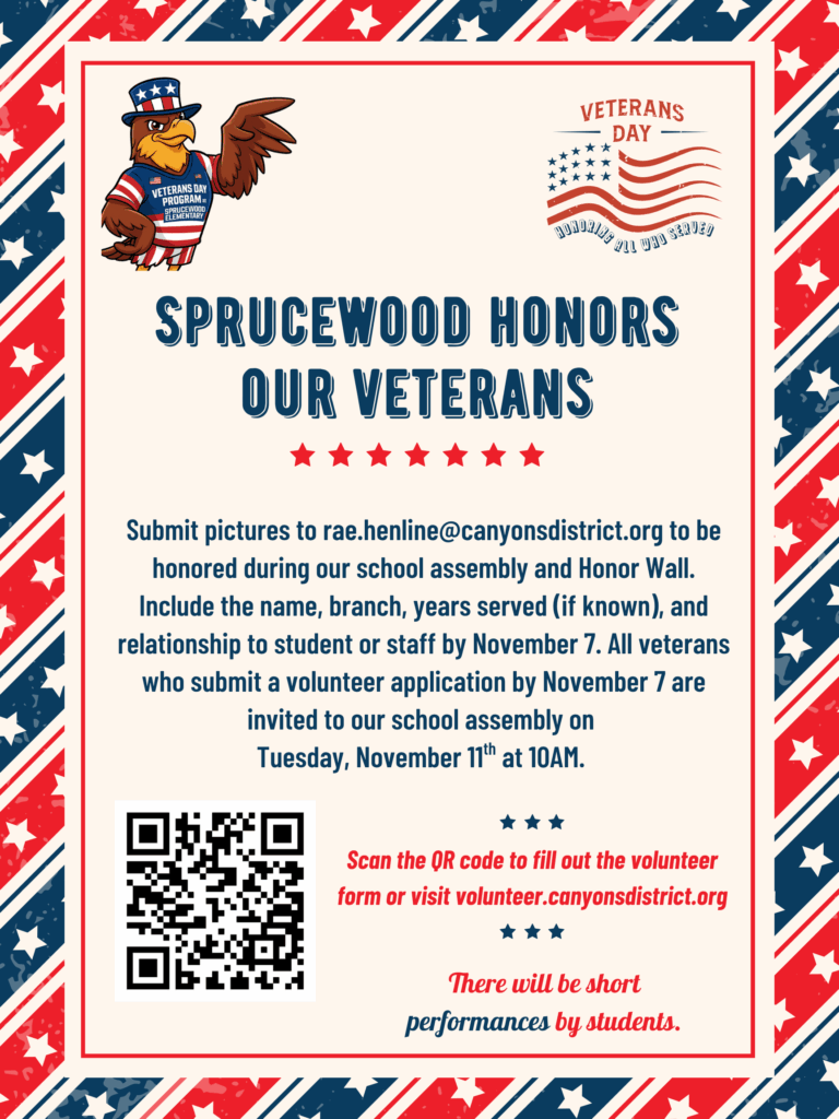 Submit pictures to rae.henline@canyonsdistrict.org to be honored during our school assembly and Honor Wall. Include the name, branch, years served (if known), and relationship to student or staff by November 7. All veterans who submit a volunteer application by November 7 are invited to our school assembly on Tuesday, November 11th at 10:00 AM. There will be short performances by students.