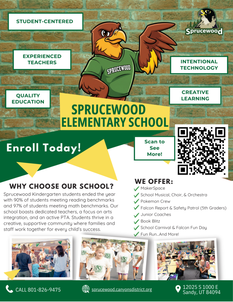 Scan the QR code on the flier below to see an awesome video of the learning and fun that happens daily at Sprucewood Elementary School.